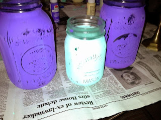 Cute eh? Note: This color was actually achieved by accident. I dipped my sponge paint brush into the vanilla cream colored paint-which had accidentally ran into the teal paint-when I done the paint stroke-it came out like this....and I liked it!....so much in fact-I painted another jar like this on purpose adding hints of purple and teal! LOOK: